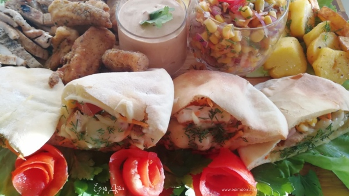 Рядом укладываю питы. Ребятишкам нравится создавать свое блюдо самим. Наши в питу укладывали салат, стейк и стрипсы, кружочек картофеля и поливали соусом. А мы ели салат вприкуску с питой.