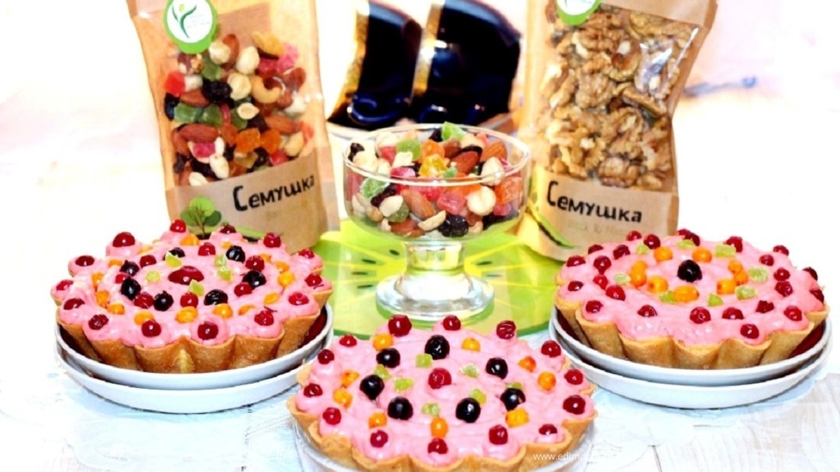 Украшаем тарт ягодами, мелкими сухофруктами ТМ «Семушка» и охлаждаем в холодильнике. Десерт готов! Приятного чаепития!