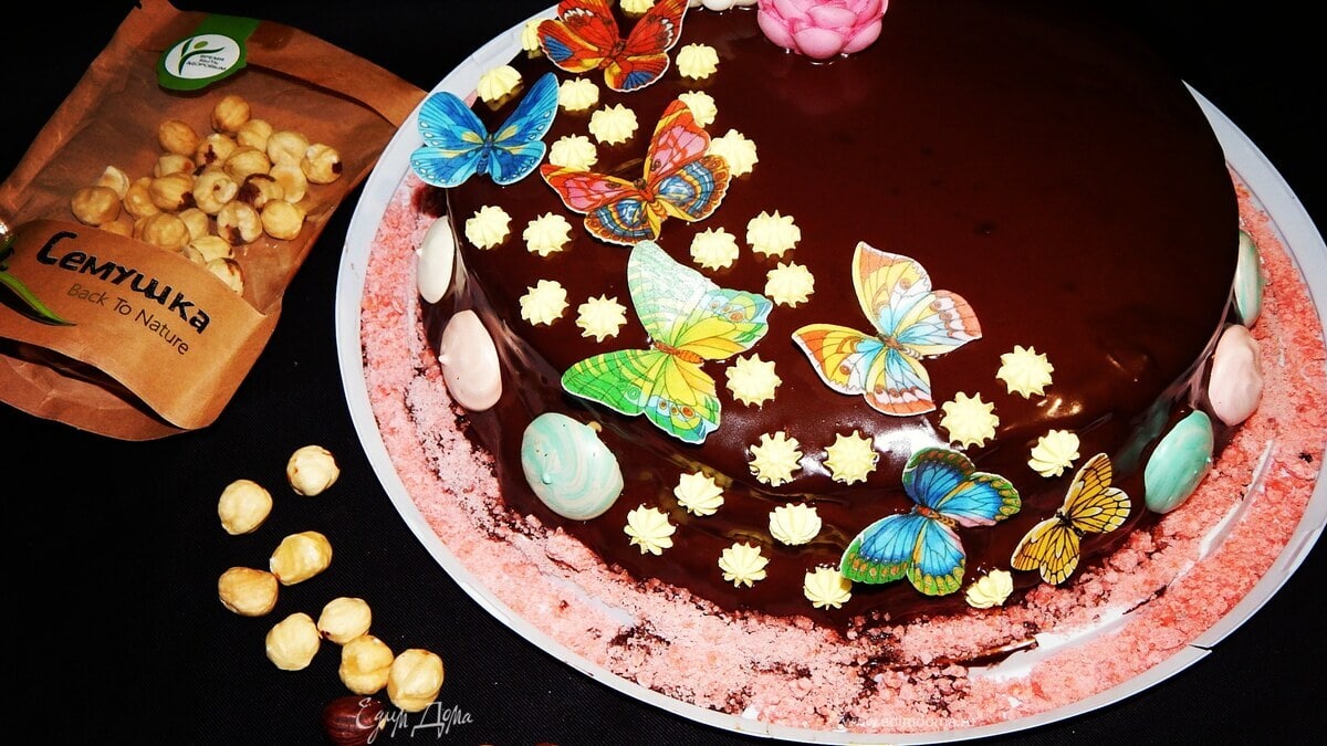 Поливаем торт шоколадным ганашем и распределяем его шпателем по всему торту. Украшаем по желанию. У меня вафельные бабочки, цветы и безешки. - Шаг 14