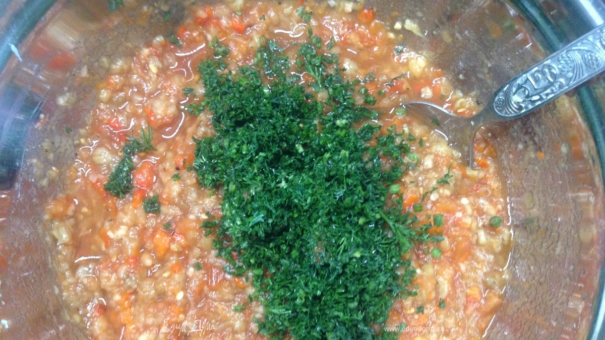 Соус из печеных помидоров, баклажанов, сладкого перца, с чесноком, солью и перцем, с зеленью...