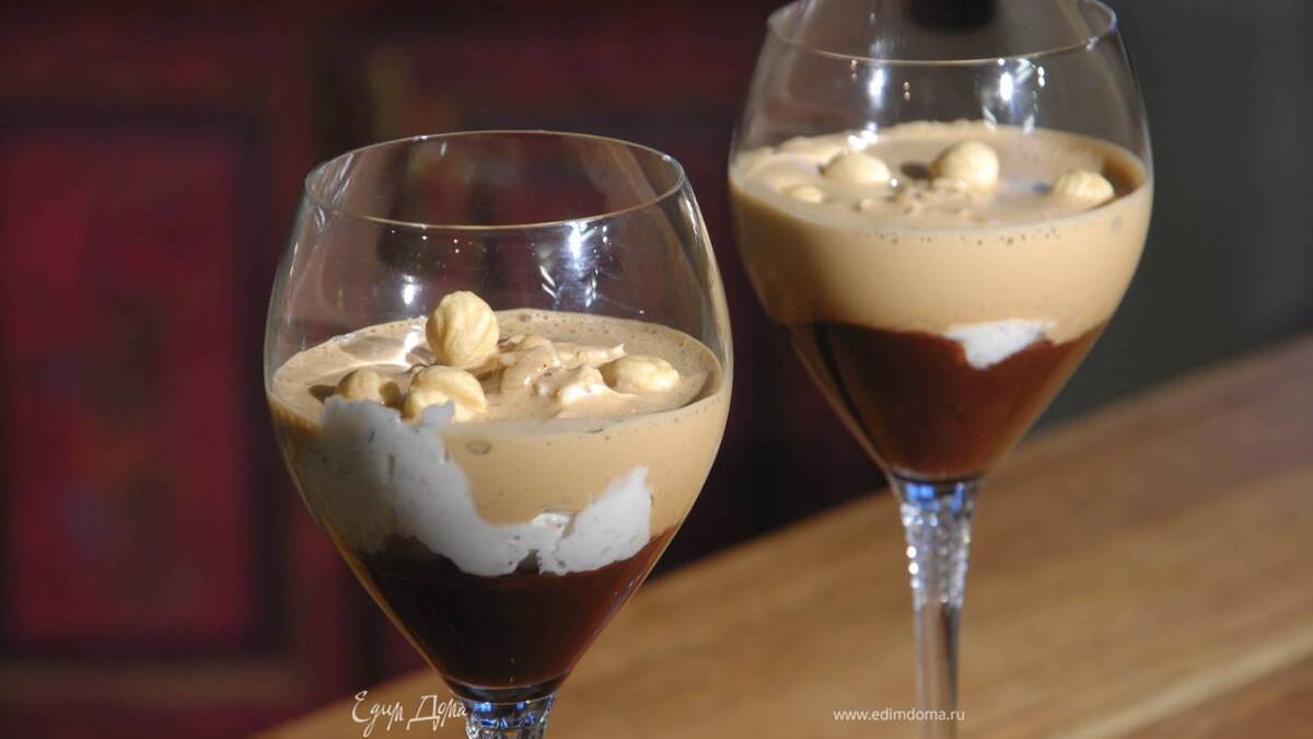 Это замечательный трехслойный десерт — специально для тех, кто любит кофейно-шоколадные вкусы, и что мне еще нравится в этом муссе — он в меру сладкий. Коньяк можно заменить ромом, а орехи подойдут любые.