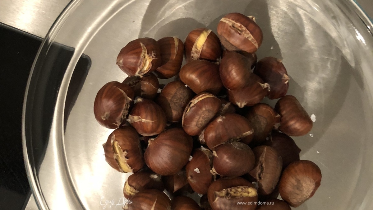 Как только готовы каштаны, выложить в глубокую тарелку. Посолить крупной солью, перемешивая. Накрыть влажным полотенцем или тряпкой. Держать под полотенцем 2–5 минут. - Шаг 5