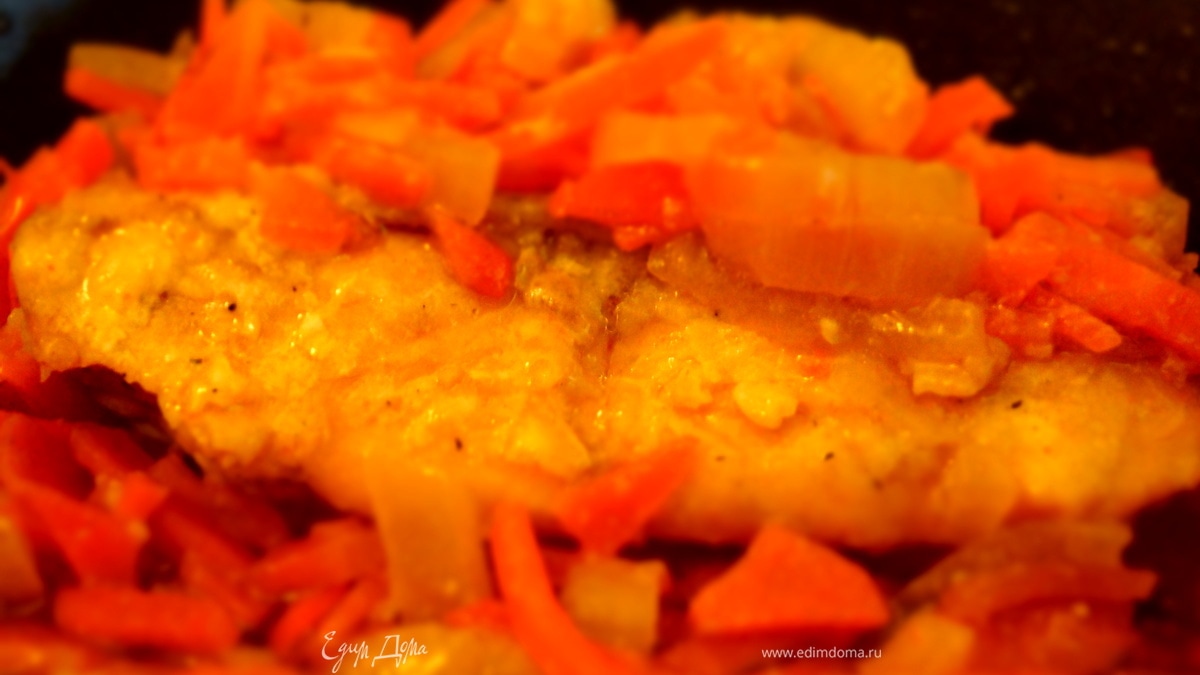 Когда овощи готовы, выкладываю их на обжаренную рыбу, сверху выливаю юшку оставшуюся от маринада, разбавленную кипятком, накрываю сковороду крышкой и оставляю тушиться 10-15 минут на медленном огне. - Шаг 6