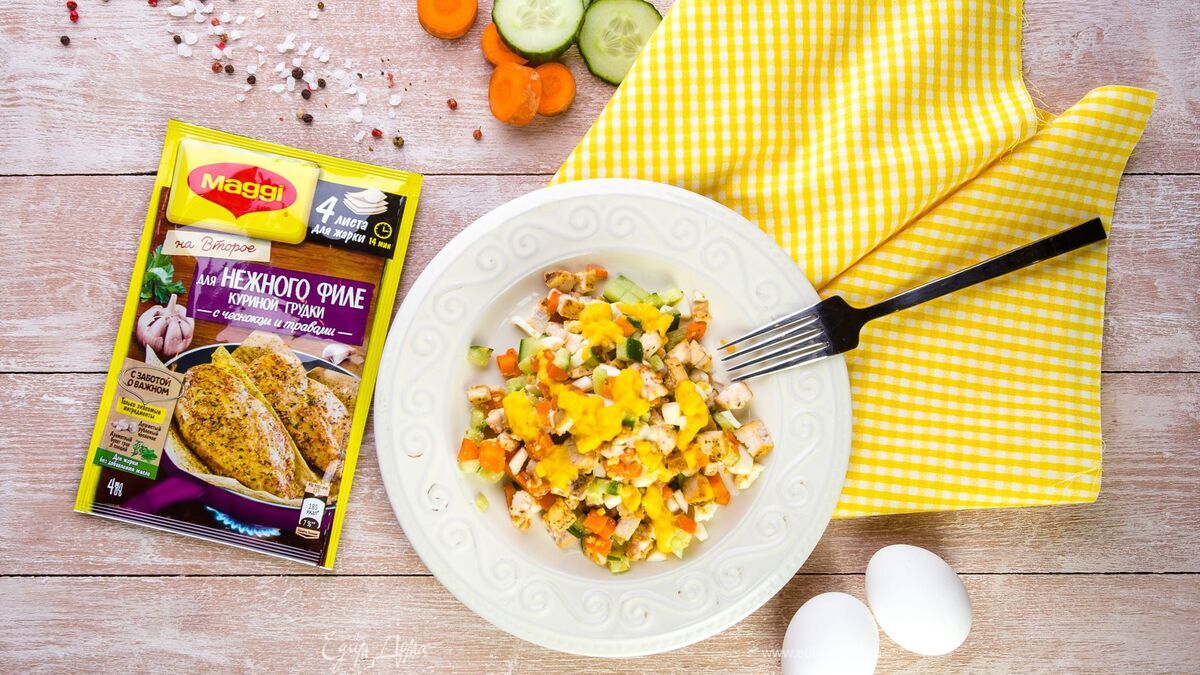 Смешайте все продукты для салата: куриное мясо, морковь, огурцы и яйца. Полейте салат заправкой, тщательно перемешайте и украсьте зеленью. - Шаг 9
