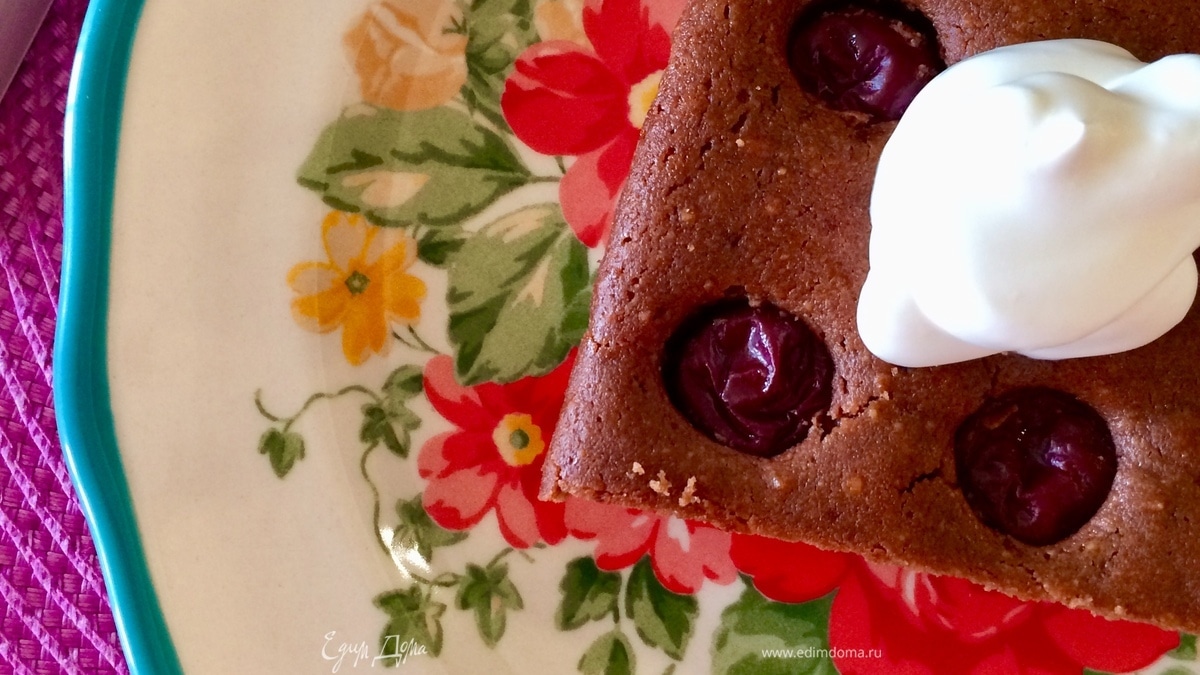 Потом просеиваем какао и слегка перемешиваем. В конце добавлем муку, разрыхлитель, соль и еще раз хорошо перемешиваем массу. Перекладываем массу в форму (форму лучше застелить бумагой для выпечки), распределяем и сверху украшаем вишней. Выпекаем пирог до готовности 30–40 минут. - Шаг 3