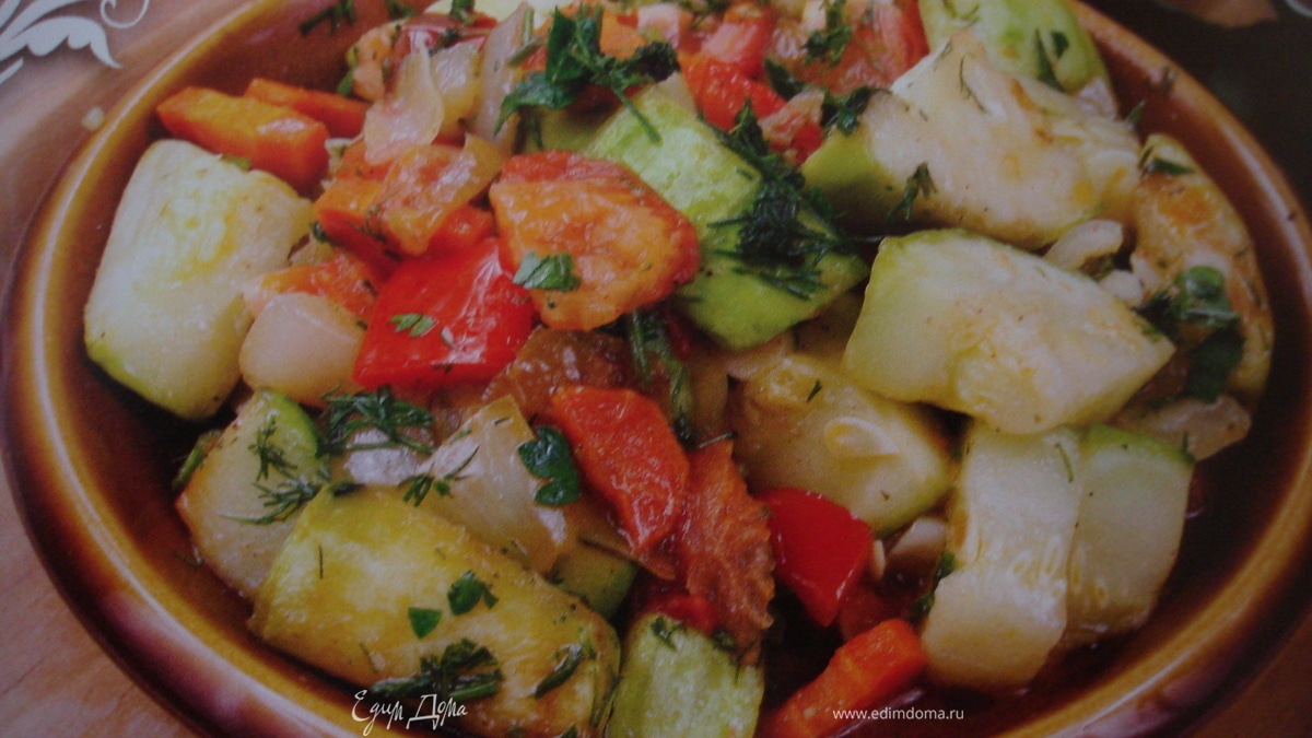 - ПодготовкаОвощи крупно нарезать обжарить лук и морковь, затем добавить кабачок и перец. Когда овощи подрумянятся, добавить помидоры, давленый чеснок и тушить под крышкой 15мин. на медленном огне. Рис отварить.Грибы обжарить. Смешать тушеные овощи с рисом и грибами, заправить оливковым маслом и подавать к столу.
