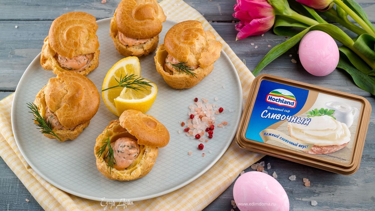 Сегодняшний рецепт профитролей со слабосоленой красной рыбой и сливочным сыром — отличный вариант закуски к фуршетному столу. К тому же готовятся они просто и не займут у вас много времени. Итак, приготовим сначала профитроли, для них нам понадобятся: сливочное масло, вода, соль, мука и яйца. Для идеального теста яйца надо вводить по одному, в самом конце, постоянно помешивая. Выпекаем профитроли до золотистой корочки в разогретой до 200 °С духовке 20 мин. Тем временем займемся приготовлением начинки. Для начинки профитролей со сливочным сыром и лососем смешиваем в блендере: лосось, предварительно нарезанный на небольшие кусочки, укроп и сыр. Теперь остается только срезать с приготовленных булочек верхушку и наполнить их начинкой. Подавать профитроли с лососем и сливочным сыром желательно с лимоном, красиво выложив их на тарелке. Надеемся, этот рецепт профитролей с сыром и рыбкой займет достойное место в копилке ваших рецептов!