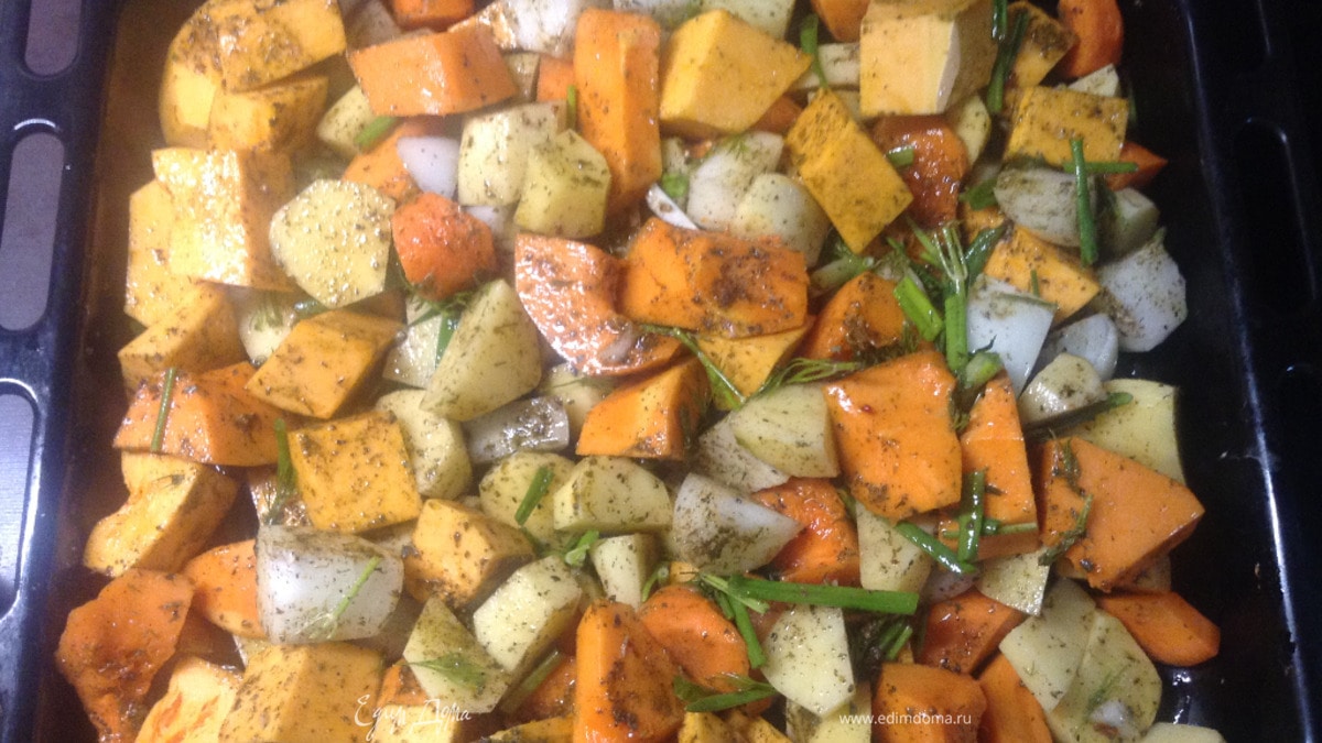Ну, и все, собственно. Все фантазии:) Вот эта «самобранка» — на большую компанию, когда на ужин друзья пришли. Все немелко нарезали, тут картошка, лук, тыква, морковь, чеснок, зелень-соль-перец — и вот тут-то маслицем хорошенько. Перемешали — в духовку — через 40 минут прямо в таком виде на стол, ну, или еще как. Я просто считаю, что демократия, она самоценна:) Из такого на столе — каждому по желанию. Приятного аппетита!
