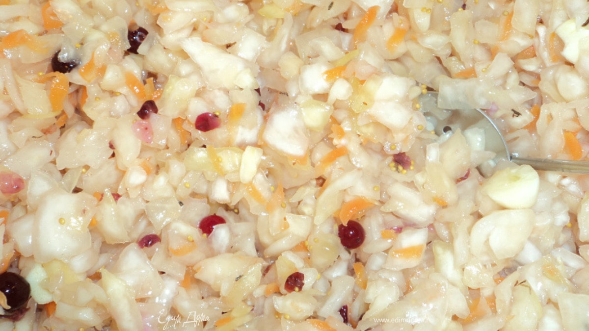 Чуть не забыл, во время укладывания в банки бруснику с клюквой добавим чуть — цвет придает и вкус добавляет. Брусника (плюс к моркови) сладкого, а клюква — дубильные вещества, будет хрустеть капустка. К картошке вареной или печеной. Вкус не передать. Ну, и очень здоровый продукт на столе. Витаминный! Весенний:)