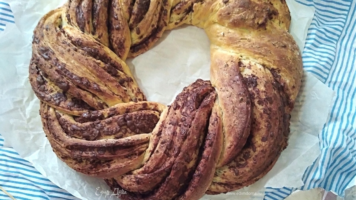 Венок из дрожжевого сдобного теста с добавлением творога, а начинка — из шоколада и корицы. Такая душевная выпечка