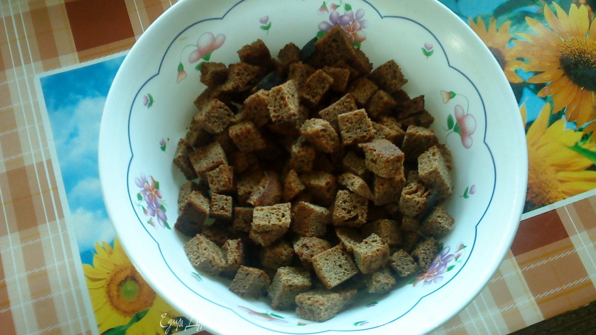 - Шаг 1Все очень просто. Хлеб нарежьте кубиками и натрите чесноком.Сушите в духовке. Я люблю, когда они остаются немного мягкими внутри.Вкусненько есть их теплыми.