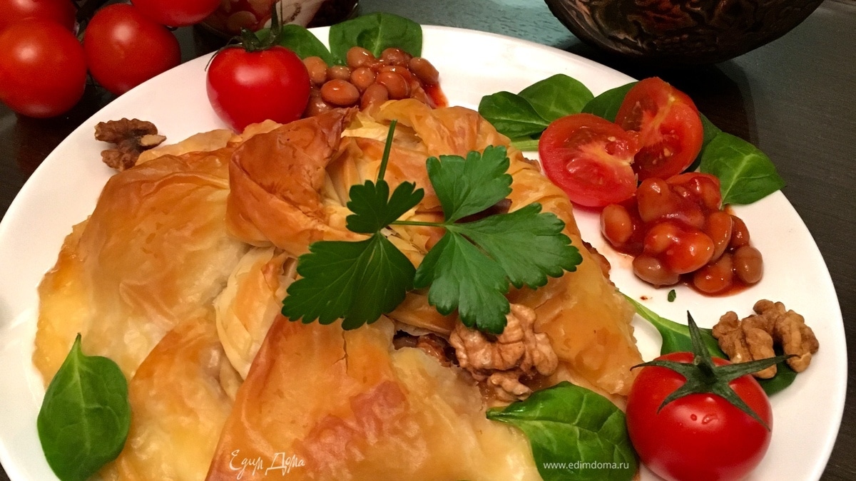 Если у вас намечается вечер с друзьями и вином, приготовьте эту легкую и быструю, но при этом яркую и колоритную закуску с намеком на изысканность! Ароматный козий сыр, запеченный в тончайших листах невесомого теста фило с медом и орешками, станет фаворитом вечера. А если подать в качестве овощного аккомпанемента помидоры черри, сливочную и нежную белую фасоль ТМ «Фрау Марта» и хрусткую зелень, то у блюда будет явно грузинский акцент. Такая закуска идеальна весенним вечером с бокалом хорошего вина!