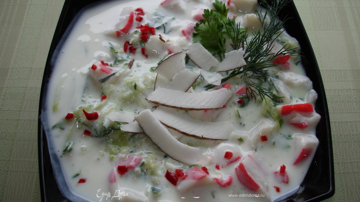 - Шаг 1Мелко нарезать зелёный лук, укроп, петрушку. Натереть огурец. Мясо краба нарезать небольшими кусочками. Если нет натурального, подойдёт имитированное охлаждённое(не размороженное). Всё соединить в тарелке, посолить, перемешать. Залить кефиром, снова перемешать. Украшено веточкой зелени, рубленным чили, тонкими полосками мякоти кокоса.