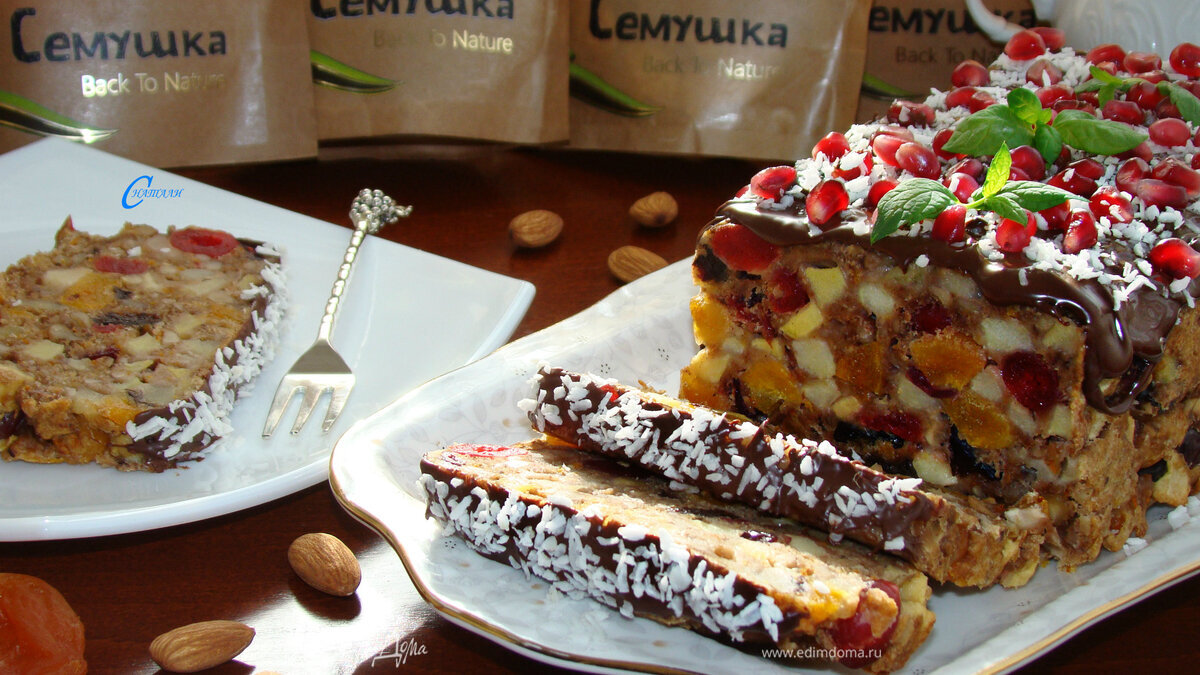 Курагу и чернослив ТМ «Семушка» промыть, просушить и нарезать. Вяленую вишню и клюкву промыть и просушить. Миндаль и кешью измельчить. К смеси добавить цедру апельсина и лимона. - Шаг 2