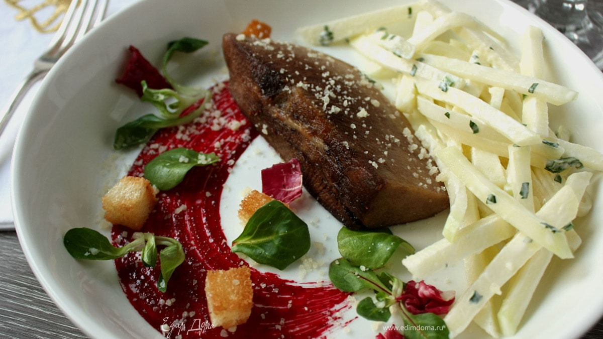 Обжаренный язык с салатом из кольраби