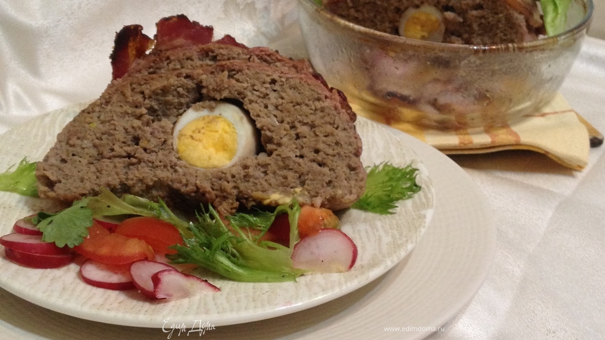В жаропрочную форму выложить половину фарша и отварные яйца, накрыть второй половиной фарша. - Шаг 4