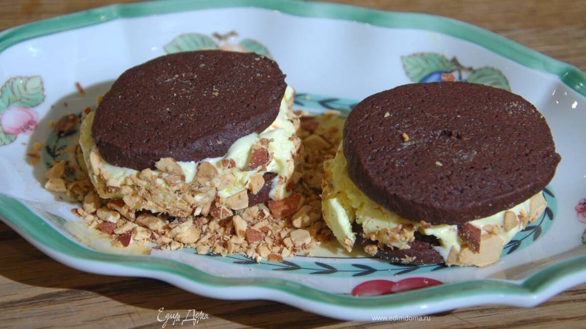 Готовое мороженое разложить на половину всего печенья, накрыть оставшимся печеньем, обсыпать получившиеся сэндвичи измельченным миндалем и отправить ненадолго в морозилку.
