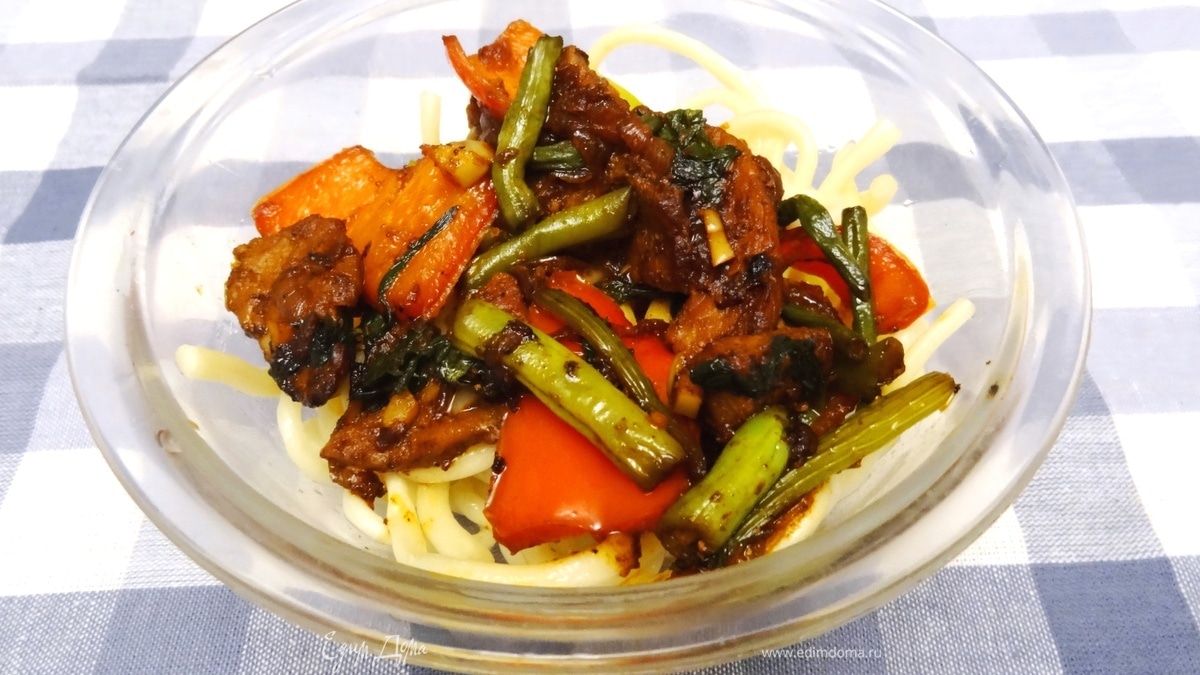 В тарелку положить лапшу, а сверху — мясо с овощами, перемешать. - Шаг 11
