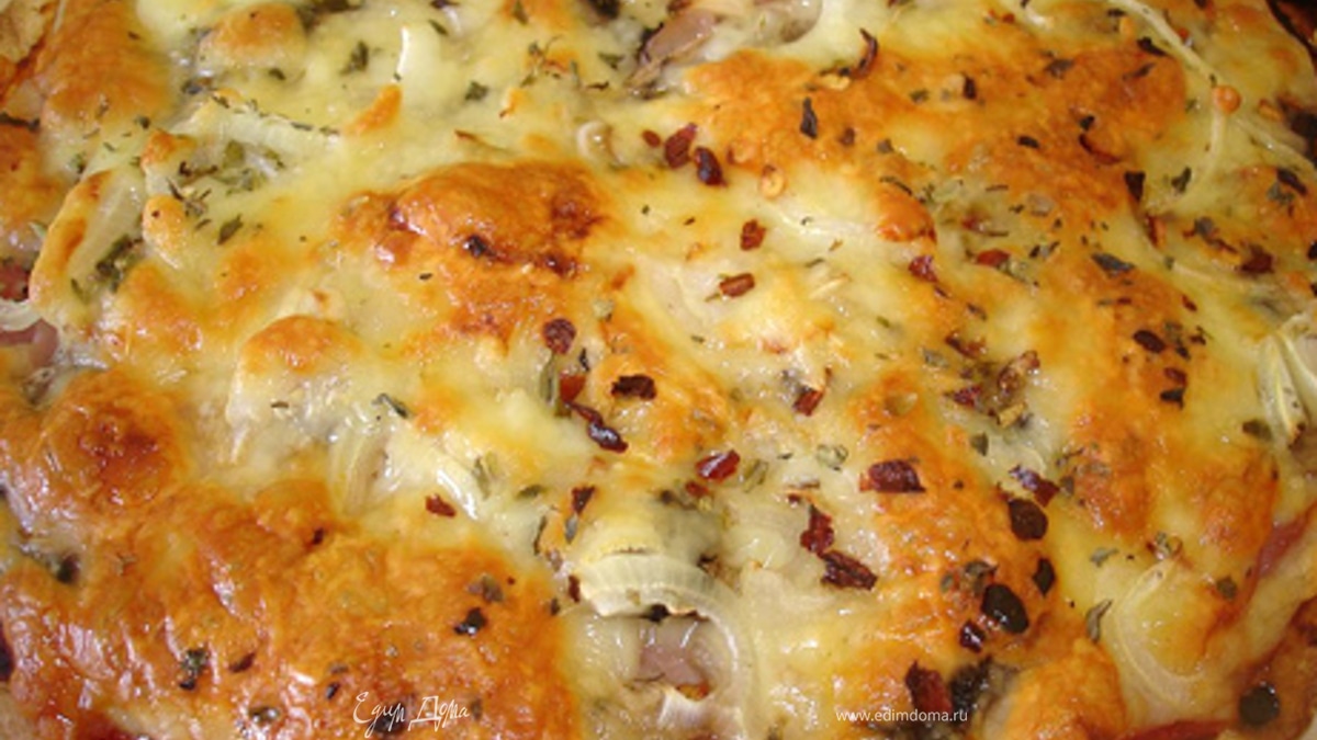 - Шаг 1Тесто раскатать и уложить на смазанный маслом противень. К нарезанным грибам добавить 1 столовую ложку растительного масла, чеснок, стакан белого вина и варить 15 минут. Посолить. Тесто смазать маслом и покрыть нарезанными томатами, кусочками ветчины, грибами и ломтиками сыра. Поставить в разогретый духовой шкаф и выпекать в течении 20 мин.