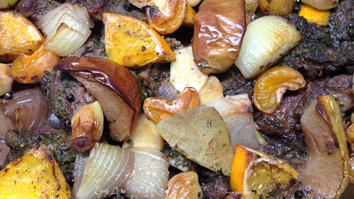 Вот что точно не упустить — лук репчатый (с говядиной в духовке аромат жаркого придает завсегда), чеснок, апельсин... Этот рыжий кусочек солнышка с винами красными дает неповторимый букет к мясу.