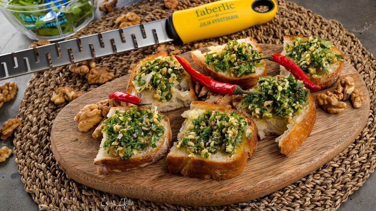 Намажьте брускетты соусом песто, посыпьте оставшимся сыром. Приятного аппетита!