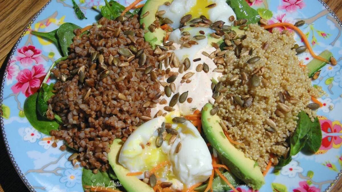 Яйца почистить, поместить на салат и слегка надрезать, так чтобы желтки потекли, рядом разложить отваренную гречку и киноа, посыпать все семечками.