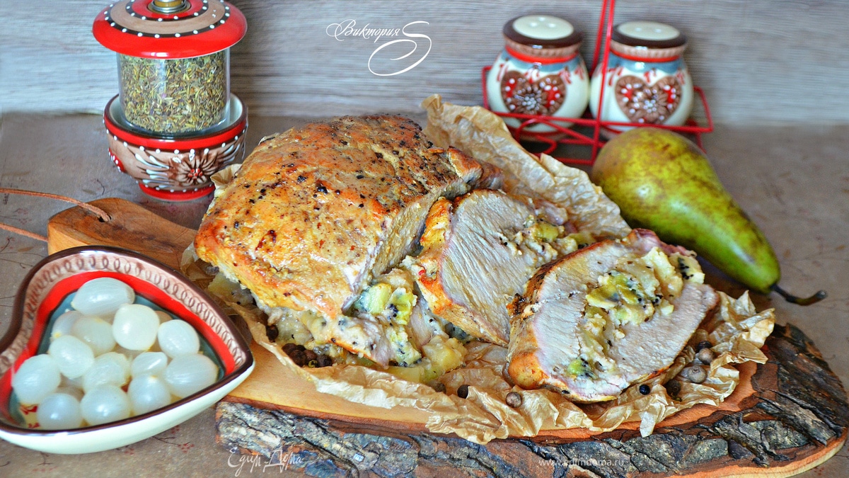 Свиная корейка, фаршированная киви и грушами