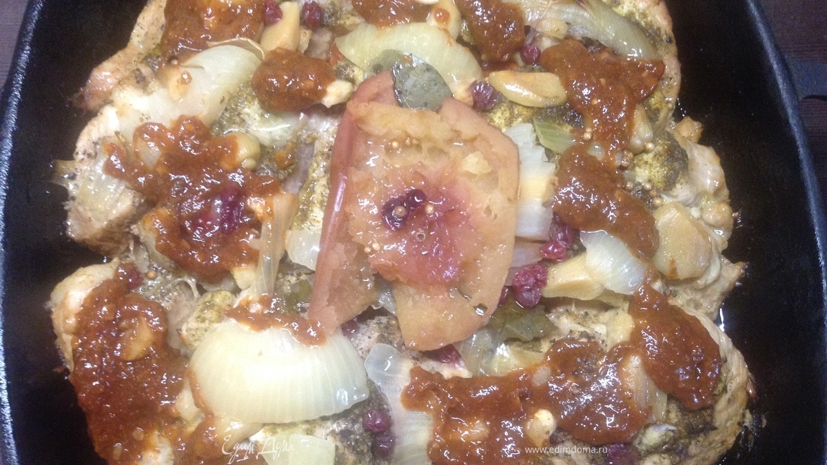 укладываем. Кроме чеснока-лука и перца-соли с хмели-сунели — на глаза попалось пол-яблока (от телятины по-екатеринбургундски осталось) да брусники чуток (от соуса «К мясу») — так и их сюда же! - Шаг 9