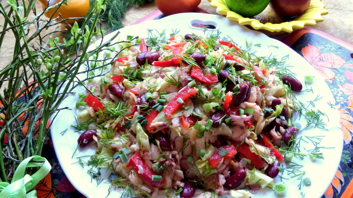 Переиграем салатную «классику»: копченая курица+фасоль+майонез на свой вкус. Курочку предлагаю отварную, а заправку пикантную, остальные овощи по наличию, и будет вкусно! И да, красная фасоль будет смотреться интереснее в данном салатике.