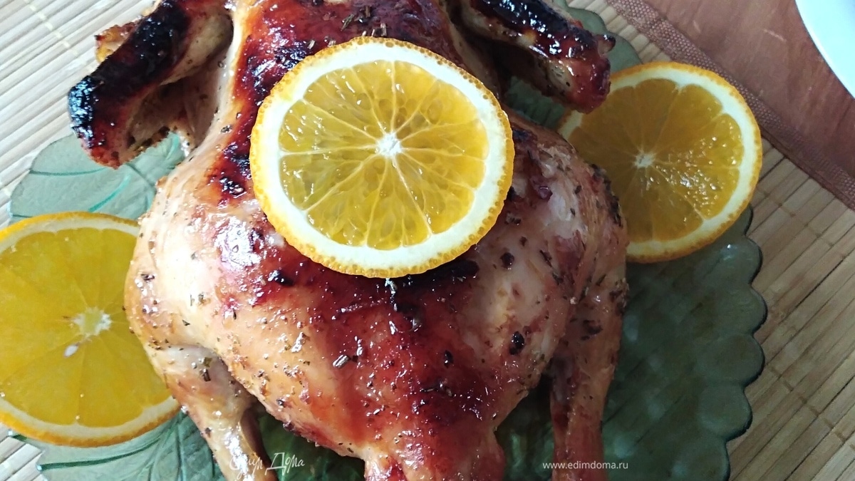 Духовку разогреть до 200°C. В смазанную маслом форму для запекания уложить курочку, полить маринадом и поставить в духовку. Когда подрумянится, перевернуть. Можно прикрыть фольгой те части курочки, которые быстрее зажарились. Оставить отдохнуть на 10 минут и можно подавать, украсив апельсином. Приятного аппетита!
