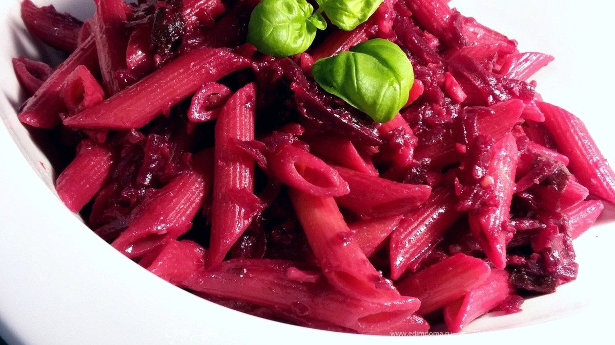 Макароны под свекольным соусом