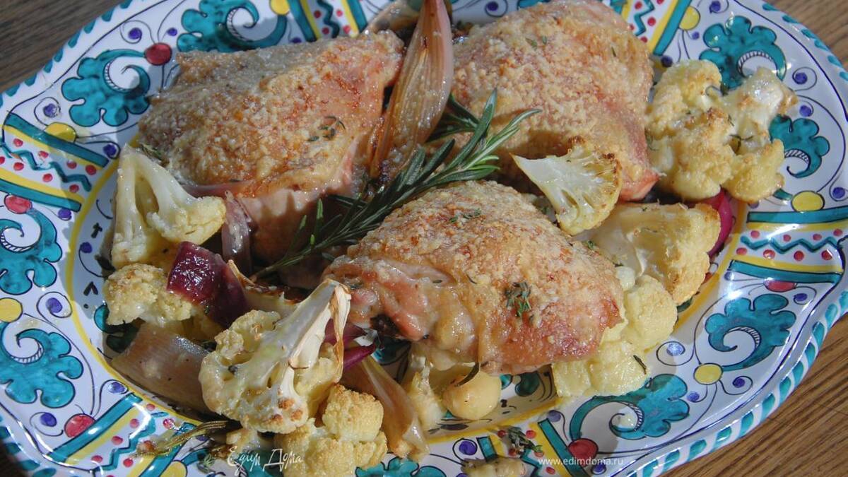 Куриные ножки, бедрышки, крылышки для запекания подходят идеально. Можно добавить к капусте с луком еще и разрезанную пополам молодую картошку, но все овощи должны быть выложены на противень в один слой, иначе они будут томиться, а не запекаться. Если вам не очень нравится вкус розмарина, выложите на овощи веточки целиком, а после запекания удалите.