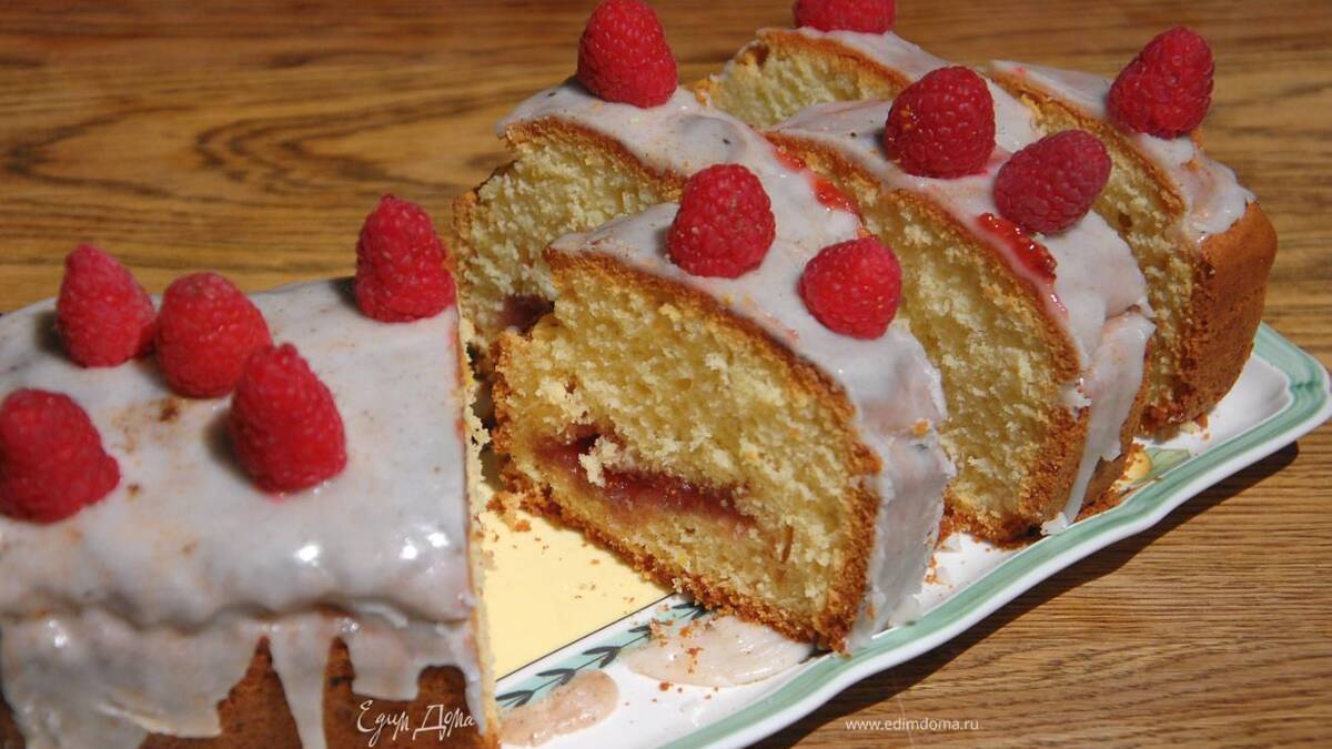 Готовый теплый кекс покрыть сахарной глазурью и украсить свежей малиной.