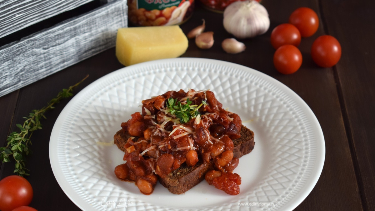 Хлеб поджарить в тостере или на сковороде. Фасоль выложить на ломтики хлеба, сверху натереть пармезан и посыпать листиками тимьяна. Приятного аппетита!