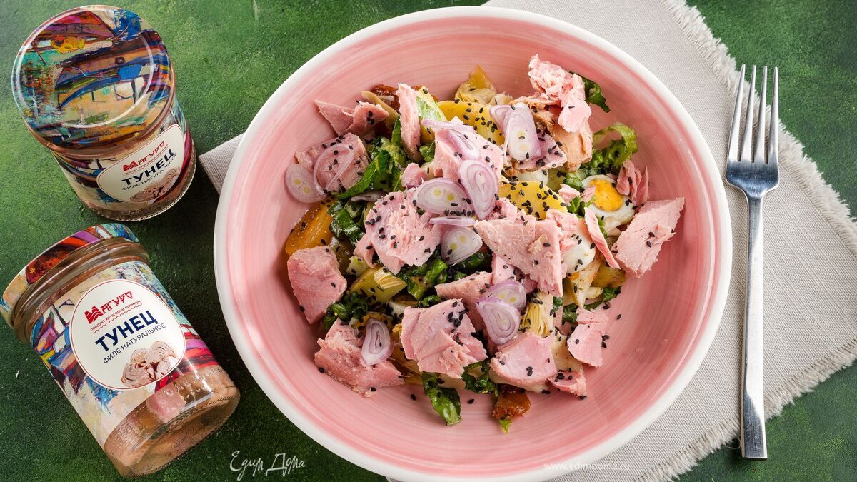 На тарелку выложите салат, сверху — кусочки тунца консервированного в с/с ТМ «Магуро». Полейте салат заправкой.