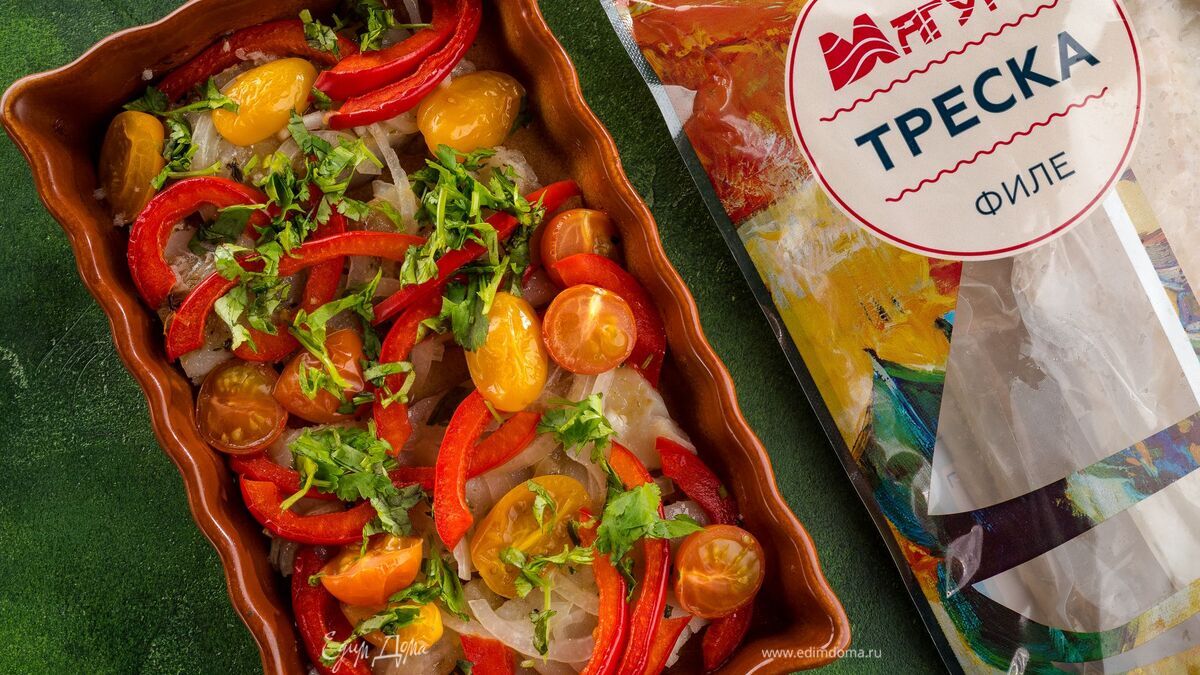 В форму для запекания выложите треску, а сверху — овощи. Накройте фольгой и поставьте в разогретую духовку. Запекайте 35 минут при температуре 180°С. - Шаг 6