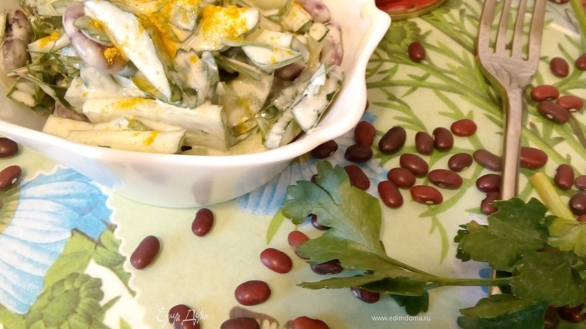 Открывает банку с красной фасолью ТМ «Фрау Марта», сливаем жидкость, кладем к огурцам. - Шаг 4