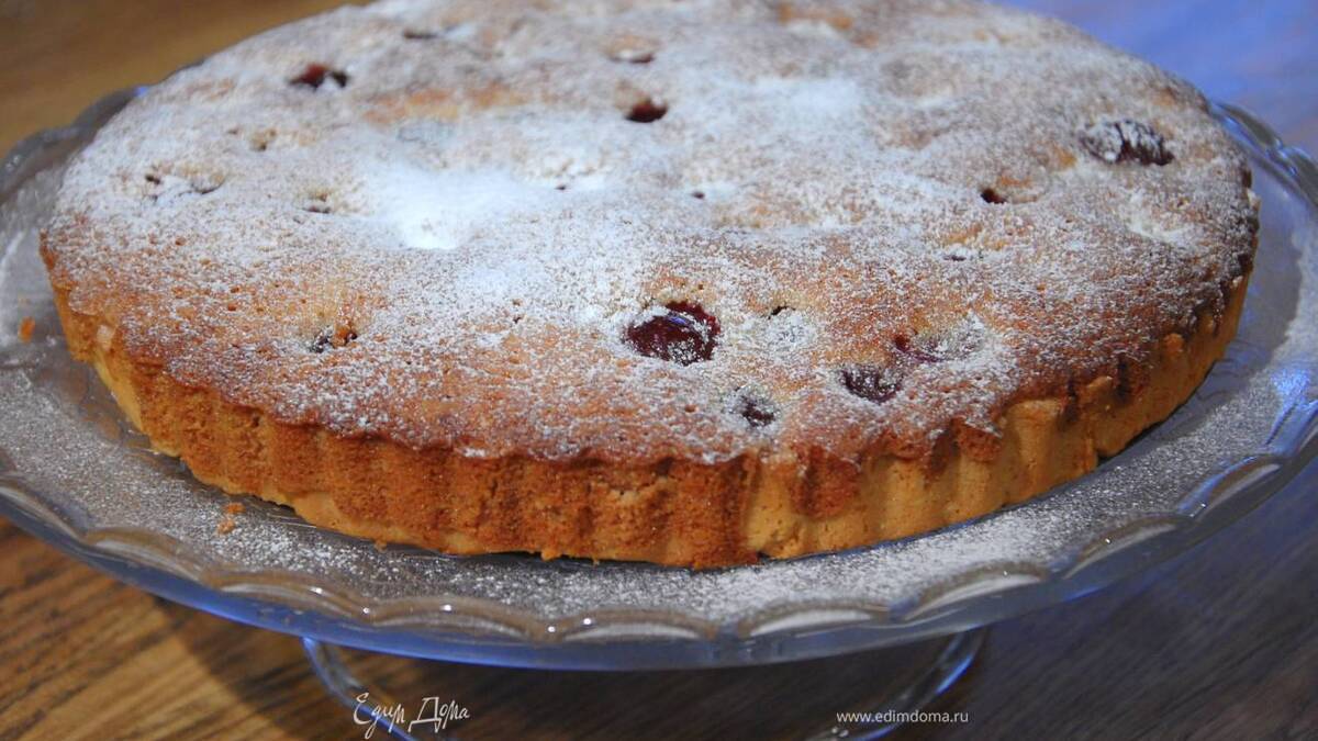 На подпеченный корж равномерно выложить крем, сверху разложить оставшуюся вишню, слегка утапливая ее, и выпекать пирог еще 20‒25 минут, готовность проверить зубочисткой.