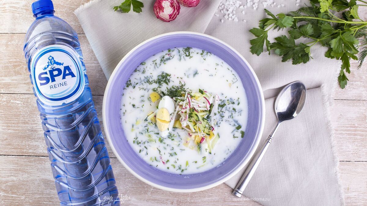 Затем залейте получившуюся окрошку негазированной водой SPA Reine и кефиром. - Шаг 8