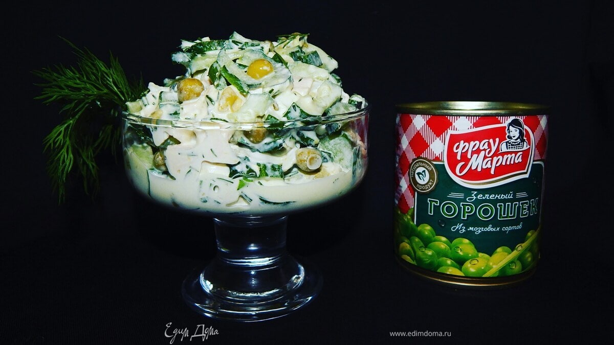 Нежный и очень вкусный салатик с копченой грудкой и зеленым горошком ТМ «Фрау Марта», который приготовила моя доченька.