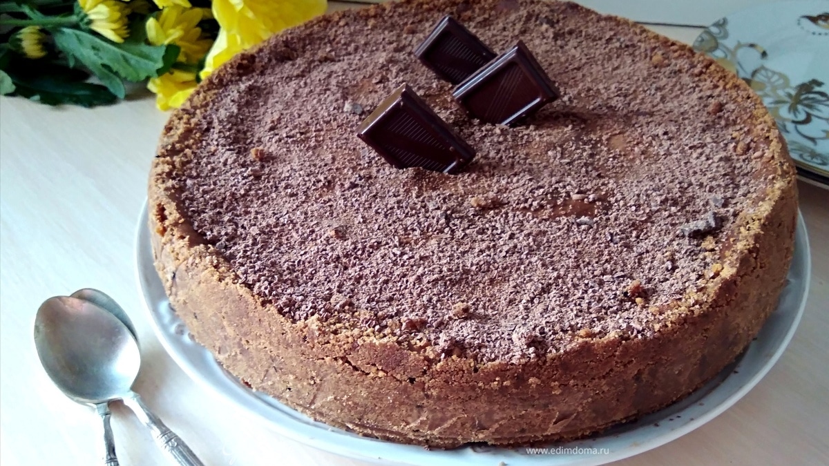 Вылить начинку на корж и разровнять. Стукнуть формой о стол, чтобы лишний воздух ушел. В форму побольше поставить эту форму, влить кипяток, чтобы вода доходила до середины формы и поставить в разогретую до 180°C духовку на 40 минут, убавить до 160°C и готовить еще 20 минут. Оставить в выключенной духовке на 30 минут. Дверцу открыть, убрать поддон с водой и дать чизкейку полностью остыть! - Шаг 10