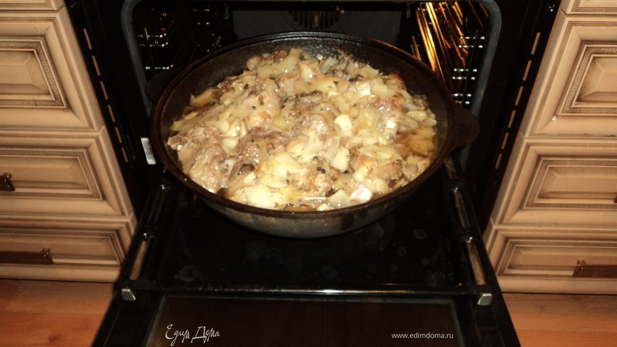 Крышкой казан прикрыли плотненько и в холодную духовку. Температуру на первый час на 240°C, потом — на 160–170°C, и так еще часа 3. Заглядывать, перемешивать не нужно. Главное — вытерпеть эти часы, ибо ароматы по дому — несказанные, непередаваемые. Когда уж совсем невтерпежь, и кажется, что уже готово, можно крышку открыть, на сильный огонь (особенно сверху) включить и дать чуть поджариться сверху. Хотя, честное слово, в данном случае это лишнее. - Шаг 26
