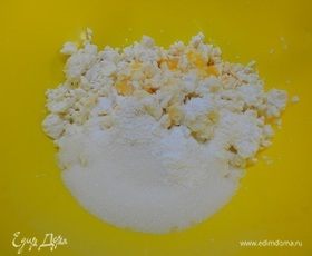 В это время к творогу добавить сахар, ванильный сахар, 3 яичных желтка и пробить погружным блендером (у меня творог был зерненый).
