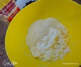 Добавить сметану и манную крупу ТМ «Националь». Перемешать и оставить набухать манную крупу, пока тесто созревает в холодильнике.