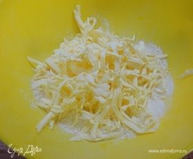 Муку смешать с разрыхлителем и натереть холодное масло. Руками растереть в крошку.