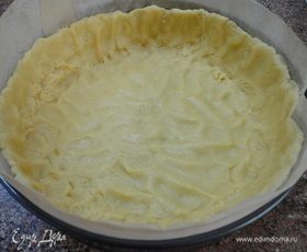 В разъемной форме бока выложить пекарской бумагой выше края на пару сантиметров (меренга может подняться). Тесто размять руками, формируя бортики.