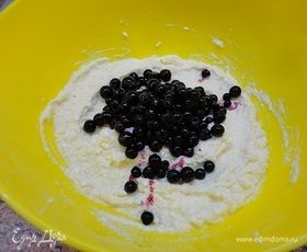 К творогу добавить размороженную смородину, осторожно перемешать.
