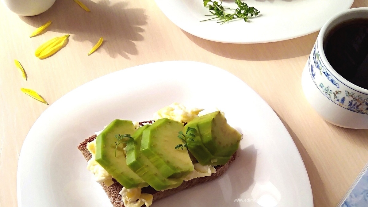 На хлеб выложить яичницу, сверху ломтики авокадо. Посолить по вкусу, украсить зеленью. Я использовала кресс-салат. Приятного завтрака!