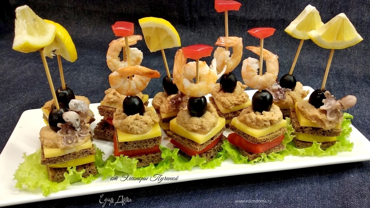 Собираем наши канапе как душа пожелает! У меня это хлеб, перец, хлеб, сыр, паштет из тунца ТМ «Магуро». На шпажку накалываем оливку, креветку и далее шпажку ставим в канапе. Также украсим наше канапе смешными осьминожками! :) - Шаг 5