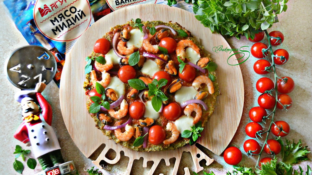 Пицца с морепродуктами на основе из брокколи